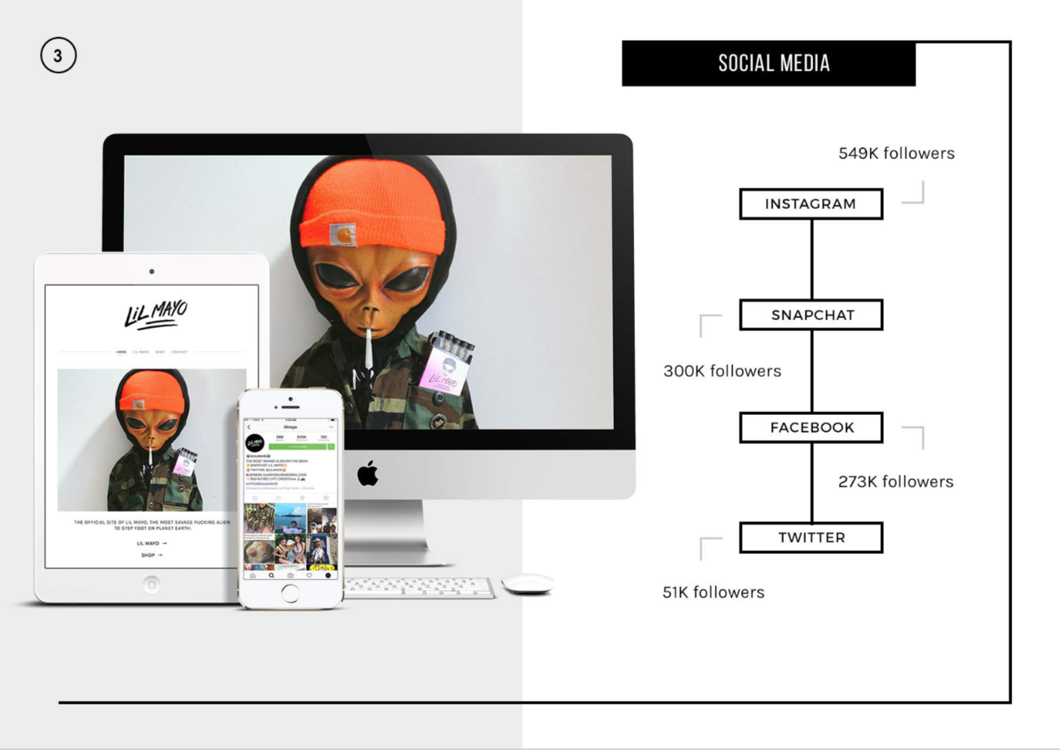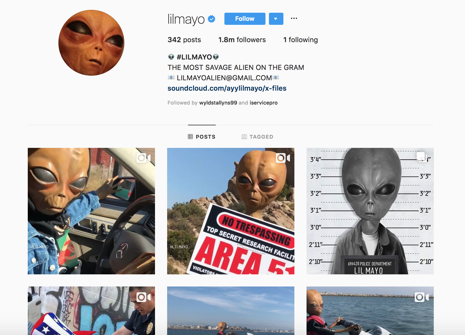 Probably the only alien to ever party with Rihanna and have 1.8 million followers - Lil Mayo is also a unicorn. I got to work with Lil Mayo and his amazing team and develop social strategy to take Lil Mayo off of just the pixels of mobile phone displays on Instagram and into merchandise, partnerships, sponsored posts and more.