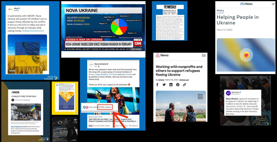 Working with Nova Ukraine, the second-largest humanitarian aid charity focused on helping Ukrainians amid the war with Russia, felt like being handed the reins to a creative juggernaut. From building their brand identity and crafting marketing campaigns to managing paid media and social media blitzes, I was in the thick of it. Designing their website and creating fundraising pages was like sculpting digital lifelines. Leading the media strategy while collaborating with an incredible team, I dove into partnership decks, media pitches, press releases, and collaborations with UNICEF, Uber, Meta, Airbnb, and even CNN. It was a wild ride, especially during a media crisis, but getting hands-on with everything was an adrenaline rush. My design, writing, and campaign strategy brain went into overdrive, and seeing the impact made it all worthwhile. Turning creativity into a force for good? Yeah, I’d sign up for that again in a heartbeat.